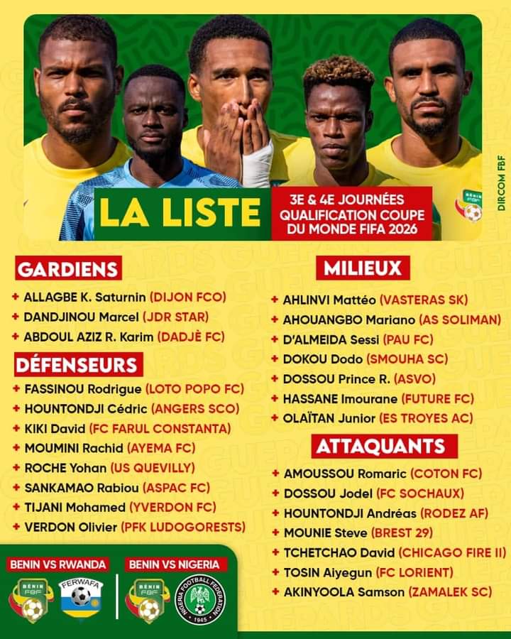 3ème et 4ème journées des éliminatoires du Mondial 2026 : Découvrez la liste des 25 joueurs béninois sélectionnés par Gernot Rohr