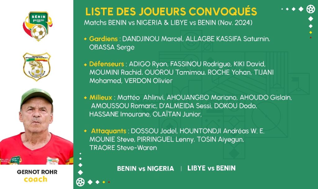 En prélude aux rencontres des Guépards du Bénin qui affronteront le Nigeria et la Libye lors des 5e et 6e journées des éliminatoires CAN 2025, l’entraîneur Gernot Rohr a dévoilé la liste des 25 joueurs retenus.