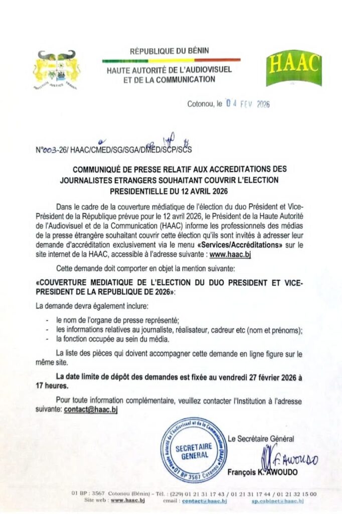 A moins de trois mois de l’élection présidentielle béninoise du 12 avril 2026, la Haute Autorité de l’Audiovisuel et de la Communication (HAAC) a adressé un message important aux professionnels des médias étrangers concernant les accréditations nécessaires pour couvrir le scrutin. L’institution de régulation des médias au Bénin a publié ce 4 février 2026 le communiqué N’003-26/HAAC, signé par son Secrétaire Général, définissant les modalités de couverture médiatique pour la presse internationale. Lisez le communiqué !!!