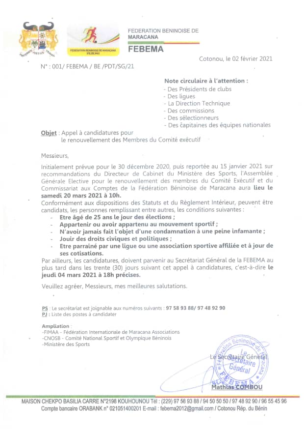 3. AG élective à la Fédération Béninoise de Maracana: Le processus d’appel à candidature relancé