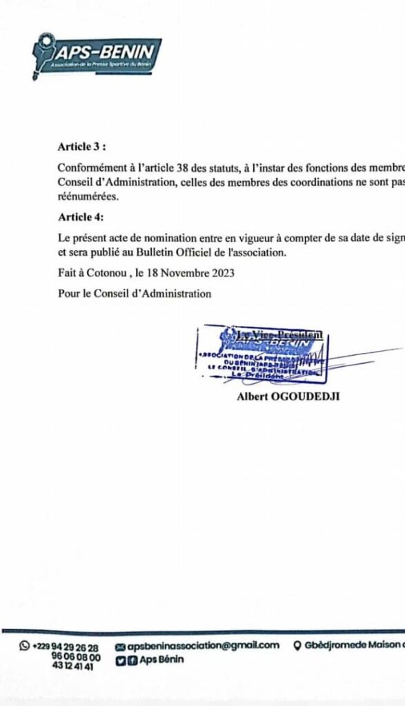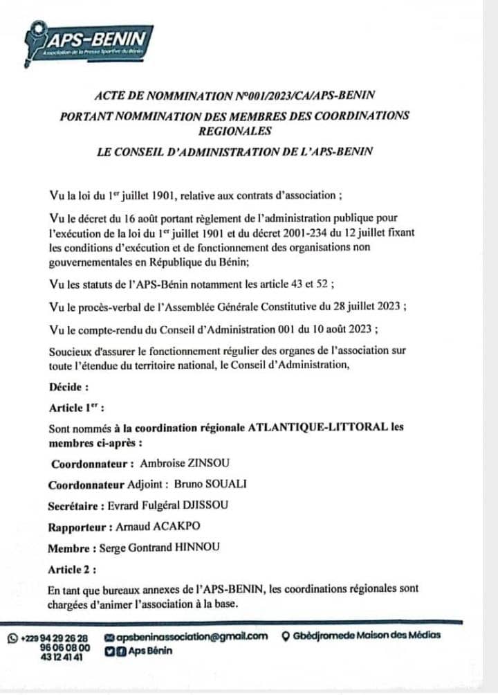Le Conseil d’Administration de l’Association de la Presse sportive du Benin (APS-BENIN) a procédé à la nomination des membres de la Coordination Atlantique-Littoral. En tant qu’organe de décision, il fait confiance à une équipe jeune dynamique qui va travailler aux côtés de l’expérimenté, Ambroise ZINSOU, Promoteur du Journal Visa-Info.