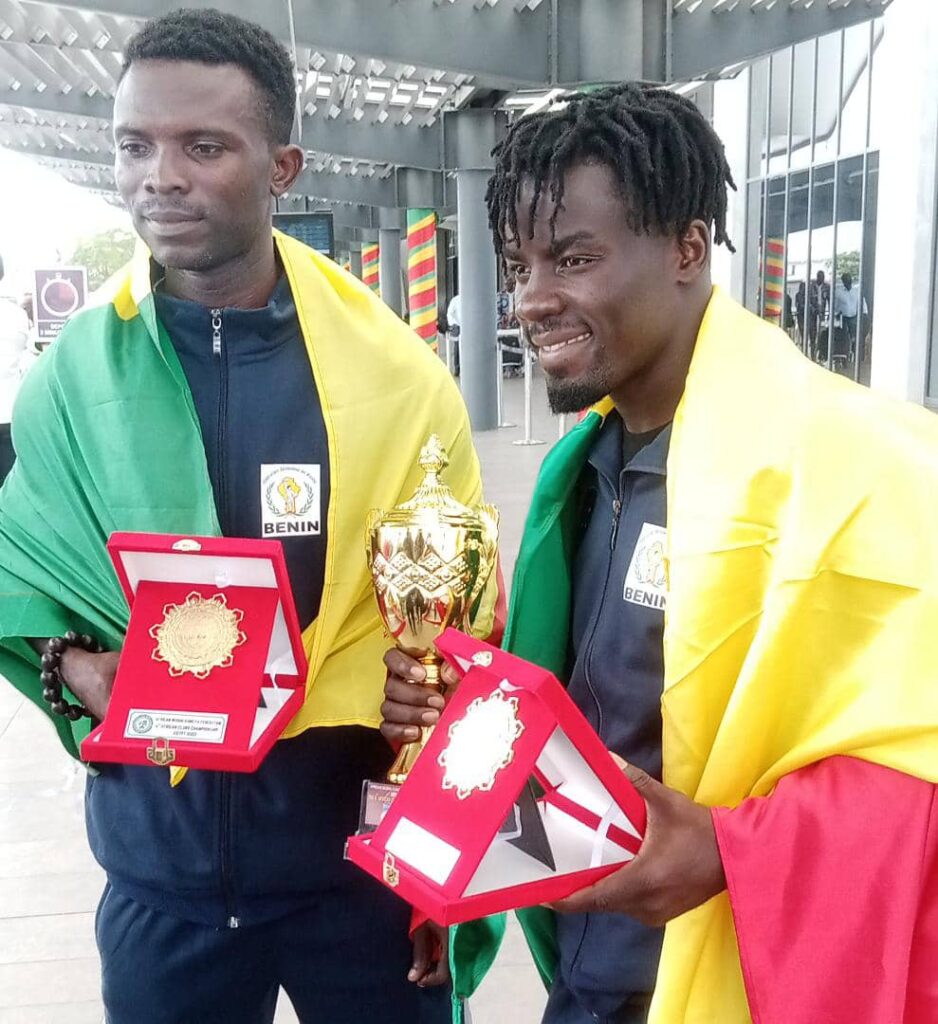 Ils ont hissé de la plus belle des manières le drapeau béninois au pays des Pyramides lors de la 6e édition du championnat d’Afrique de Wushu. Fabrice Noudofinin et Ezéchiel Adandé qui ont décroché respectivement quatre médailles en or (au niveau du Taolu plus précisément dans les rubriques Taiji quan, Taiji jian, Xing yi quan) et une médaille en or (Sanda catégorie -60kg). Ils n’ont d’ailleurs pas caché leur fierté d’avoir représenté valablement les couleurs nationales. » C’est un sentiment de fierté et de reconnaissance envers la Fédération qui nous a envoyés en Egypte. Le Grand Maitre Patrice Komenan Dossou-Yovo est un homme de discipline et le mot d’ordre au départ était de marcher sur tout ce qui bouge. Et ça a été le travail que nous avions fait », a fait savoir Ezéchiel Adandé. A l’en croire, tout s’est passé comme prévu. « La détermination que nous avions eue dès le départ, cette machine a pris le dessus. Nous sommes restés focus sur l’objectif à atteindre et les résultats sont là « , a-t-il ajouté. Pour sa part, Fabrice Noudofinin dira que c’est une grande joie de revenir au bercail avec autant de médailles. « L’exploit que nous venons de réaliser a été pour nous depuis toujours un rêve qui aujourd’hui s’est concrétisé. C’est pour la première fois qu’on est allé à une compétition continentale et revenu avec rien que des médailles en or » a-t-il indiqué.