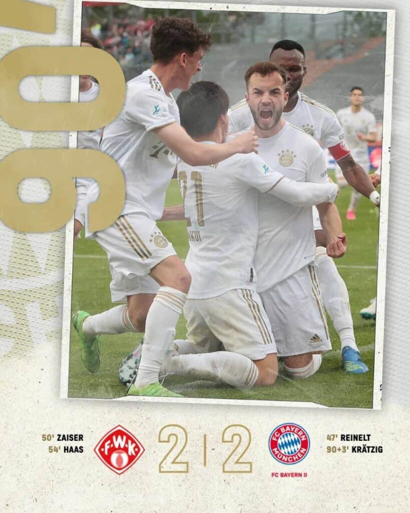 La Regionalliga Bavaria (D4/Allemagne) abordait ce vendredi 5 mai 2023 la 35ème journée. A l’occasion, la réserve du Bayern München (3e du classement) affrontait le Fc Würzburger Kickers, 2e.