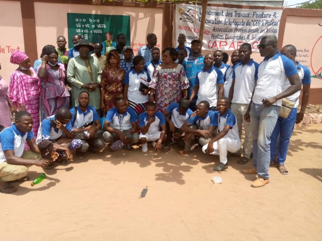 Le Collège d’enseignement général « Le Plateau » de Womey fait peau neuve. L’état de la clôture de ce lieu de savoir créé il y a tant d’années ne plaisait plus aux artisans de la localité. Regroupés sous la bannière de l’Association professionnelle des artistes peintres, calligraphes et sérigraphes de Godomey (APAPECAS), ils ont, sur fonds propres, repeint et décoré la façade extérieure dudit collège. La cérémonie marquant la fin des travaux s’est déroulée ce mercredi 9 mars 2022.