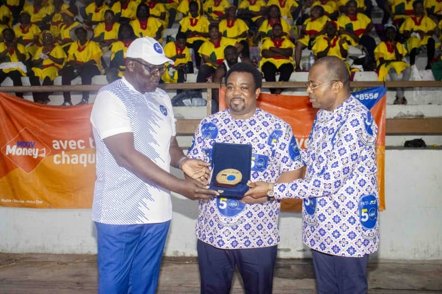 Dans le cadre de la célébration cette année des Noces d’Or de l’instance continentale, le président de la Fédération Béninoise de Handball Sidikou Karimou a reçu, des mains du président de la Confédération Africaine de Handball, Dr Aremou Mansourou accompagné du président d’honneur de la FBHB Antoine Bonou, une plaquette du cinquantenaire.