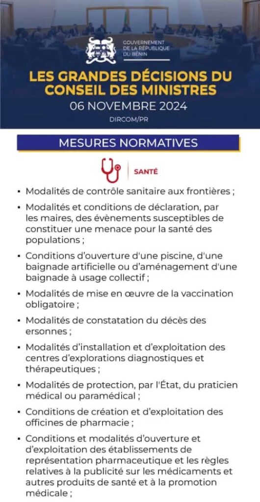 Le gouvernement béninois s’est réuni en Conseil des ministres ce Mercredi 06 Novembre 2024, sous l’égide du Chef de l’Etat, Patrice Talon. A l’issue, voici les grandes lignes.