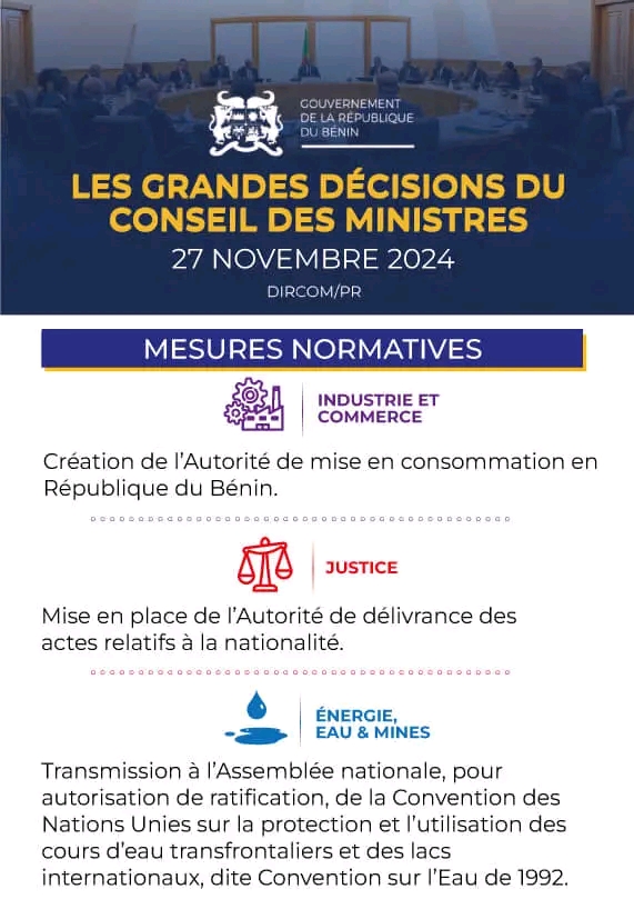 Le Conseil hebdomadaire des ministres s’est tenu mercredi 27 novembre 2024 sous l’égide du Chef de l’Etat,  Patrice Talon. Plusieurs décisions ont été prises dont voici les grandes lignes.