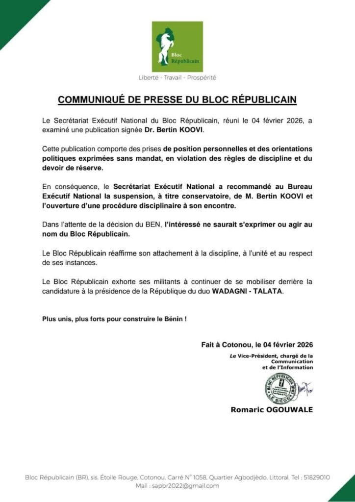 Dans l’attente de la décision finale du BEN, le Dr Bertin Koovi est interdit de toute prise de parole ou action au nom du Bloc Républicain.