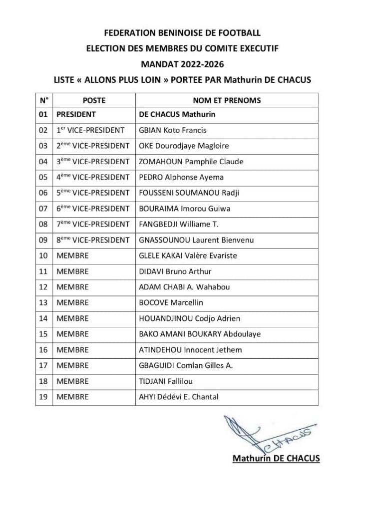 Élection à la Fédération Béninoise de Football : La liste de Mathurin de Chacus