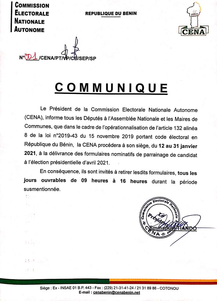 Dans le cadre de la prochaine élection présidentielle, le président de la Commission Électorale Nationale et Autonome (CENA) à travers un communiqué invite les députés et les maires des communes à retirer les formulaires nominatifs de parrainage de candidat à l’élection présidentielle.