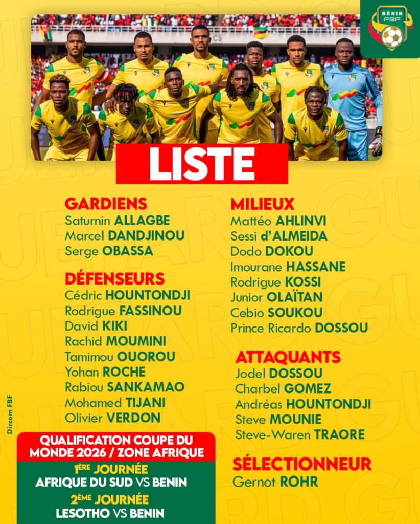 La sélection du Bénin affrontera l’Afrique du Sud et le Lesotho, lors de la première et de la deuxième journée des éliminatoires du mondial 2026 qui se disputeront dans ce mois de novembre. En prélude à ces deux rencontres, en dehors des habitués, Gernot Rohr, sélectionneur des Guépards du Bénin, a refait confiance aux jeunes qu’il a déjà expérimentés lors des dernières rencontres.