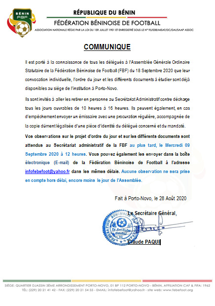Les délégués aux Assemblées générales ordinaire et statutaire de la Fédération béninoise de football (FBF) sont invités à retirer leur convocation, l’ordre du jour et les différents documents à étudier.