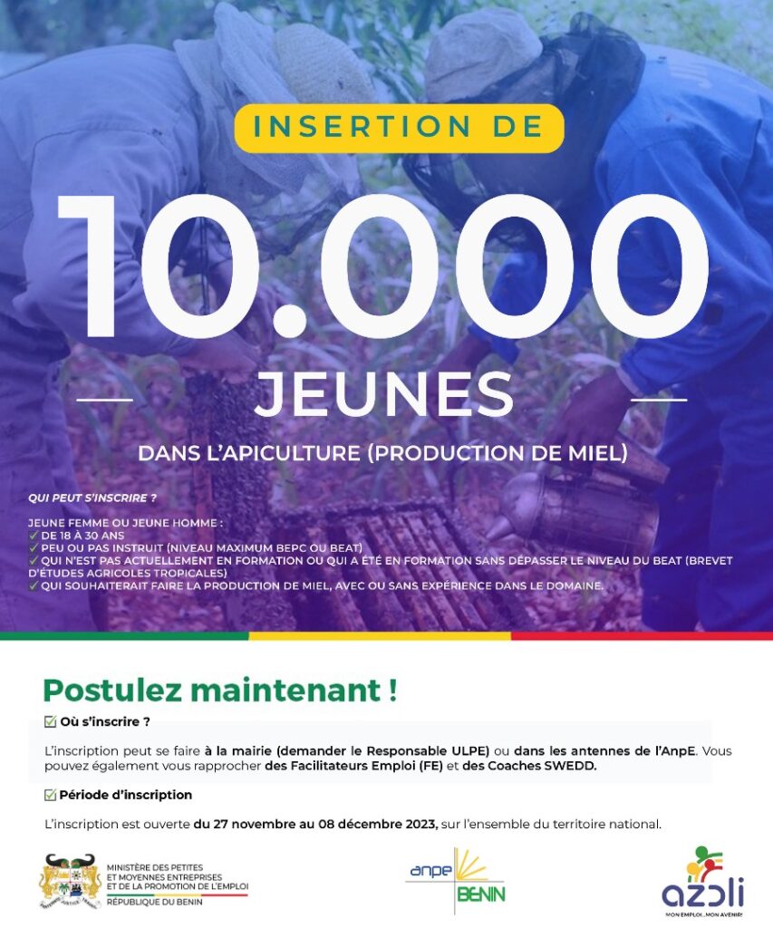Pour jouir de cette nouvelle opportunité offerte par l’ANPE, les jeunes désireux doivent s’inscrire ouverte du 27 novembre au 08 décembre 2023, dans les antennes départementales de l’AnpE, ou dans les 77 communes du Bénin auprès de l’agent de l’Unité Locale pour la Promotion de l’Emploi (ULPE) et les Facilitateurs Emploi (FE). Ils peuvent également se rapprocher des coaches SWEDD de leurs localités.