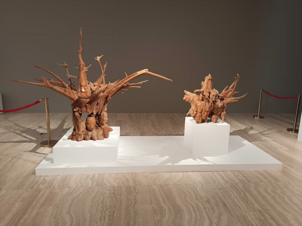 Epaphras Toïhen : (Il sourit) J’ai seulement trois œuvres dans cette exposition, dont une installation composée de trois sculptures. Et donc si je devais compter à la pièce, je dirais que j’en ai cinq. Mais d’ores et déjà, deux de ces pièces sont rentrées dans le patrimoine artistique de l’Etat. Pour me résumer, mon travail ici est représenté par deux œuvres que l’Etat béninois a déjà achetées, et par une autre qui vient de ma collection privée.