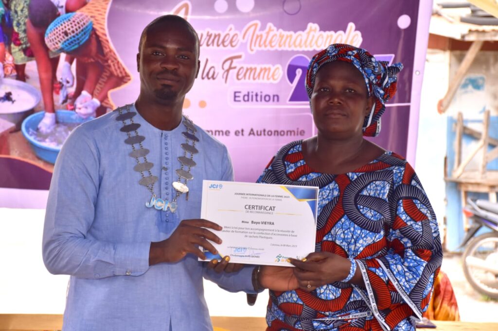 La remise d’attestations marque la fin d’un processus. Tout a commencé par une séance de salubrité organisée le 18 février 2023. Plus précisément, une opération de ramassage de sachets plastiques dans plusieurs rues aux alentours du marché de Vêdoko. Il s’en est suivi l’étape de recyclage ponctuée de formation de tricotage du 21 au 25 février 2023. Les femmes ont appris à fabriquer des sacs à main, des porte-clés et autres gadgets à usage quotidien. Leur porte-parole a, dans son mot, remercié la JCI Zénith Cotonou pour avoir pensé les associer à ce type de projet à caractère multidimensionnel.