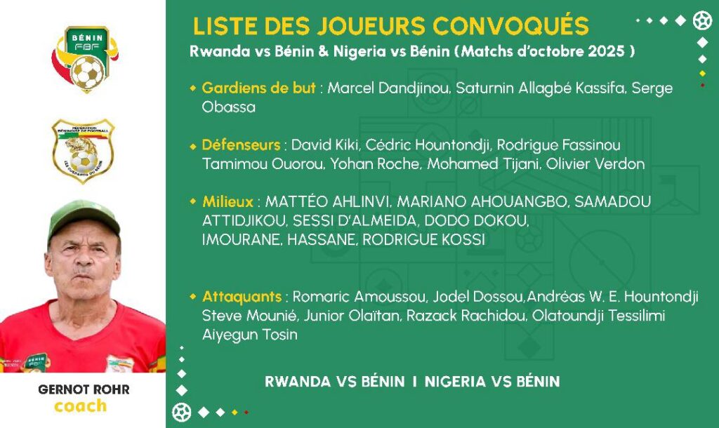 A noter que le Bénin affronte le 10 octobre à Kigali le Rwanda et le 14 octobre 2025, le Nigeria sur la terre des Super Eagles.
