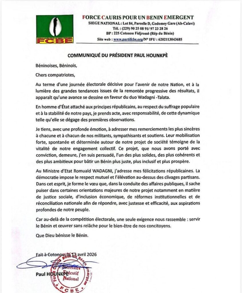24 heures après le scrutin du 12 avril 2026, le candidat Paul Hounkpè a officiellement félicité son adversaire Romuald Wadagni, reconnaissant l’avance qui se dessine dans les grandes tendances. Dans un communiqué, l’opposant salue la dynamique du vote.