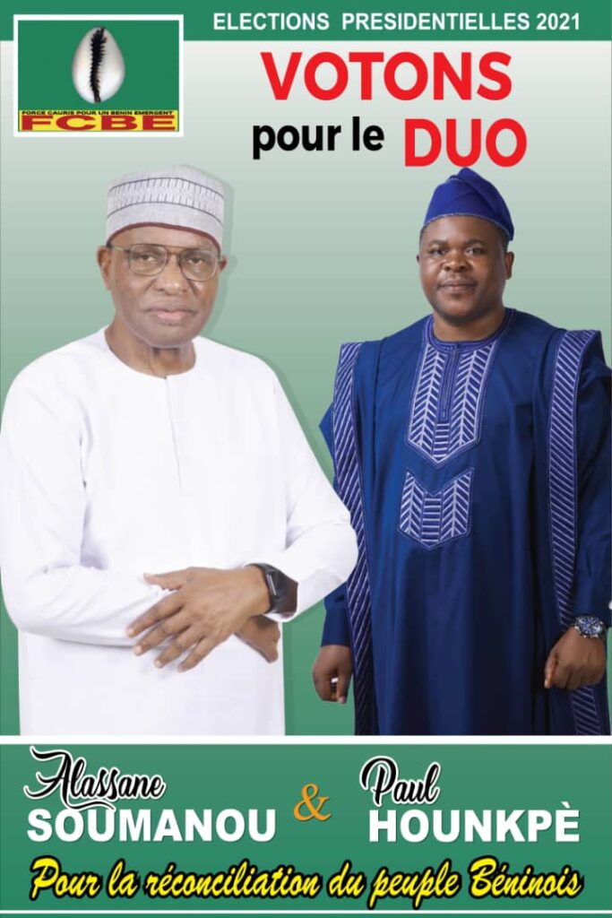 Béninoises, Béninois, il y a en lice pour le scrutin du 11 avril, trois duos dont le meilleur reste et demeure celui formé par les anciens ministres Alassane SOUMANOU et Paul HOUNKPÈ. Faites donc le choix utile. Votez FCBE pour la réconciliation nationale.