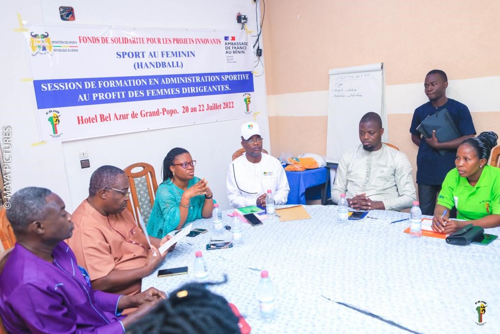 Clap de fin de la formation des femmes en gestion administrative et leadership. Une douzaine de femmes y ont pris part à Grand Popo du 20 au 22 juillet 2022. Ladite formation entre dans le cadre du Projet  »Sport au féminin » co-piloté avec le Ministère des sports et la Fédération Béninoise de Handball avec l’appui financier de l’Ambassade de France près le Bénin.