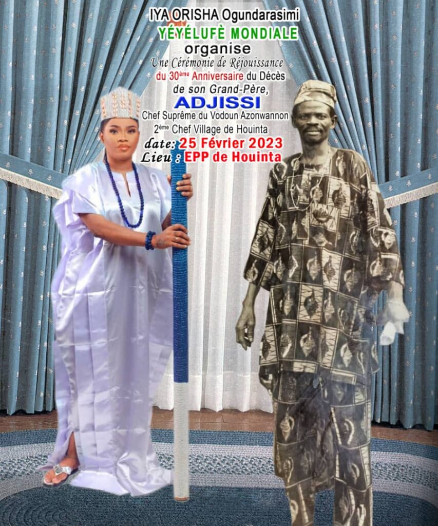 Trente ans après le décès du Chef Suprême de la divinité Azonwannon qui fut le 2ème  chef quartier de Houinta dans la ville capitale du Bénin, ses petits-enfants et autres proches se souviennent encore de lui. C’est pourquoi, sa petite fille et héritière des valeurs traditionnelles Orisha Ogundarasimi Yéyélufè mondiale a organisé ce samedi une gigantesque manifestation pour se rappeler de lui. Cet événement a drainé un parterre de gardiens de la tradition du Bénin et de la diaspora. Dans son allocution pour la circonstance, Iya Orisha Ogundarasimi a témoigné de sa gratitude à l’endroit de tous les participants avant d’inviter ses followers sur les réseaux sociaux notamment Tik Tok à toujours avoir une pieuse pensée pour les défunts selon les coutumes et traditions de leurs familles. À l’en croire, le fait de vous rappeler de vos morts à travers des prières pour le repos de leurs âmes vous confère une longévité et la paix sur terre.