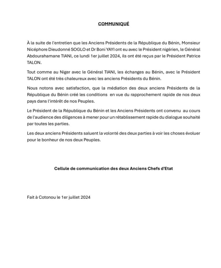 La Cellule de communication des deux anciens présidents a publié un communiqué sur le point de la rencontre entre le chef de l’Etat, Patrice TALON, et ses deux prédécesseurs Nicéphore SOGLO et Boni YAYI, ce lundi 1er juillet 2024, au palais de la Marina. Les trois personnalités ont convenu « des diligences à mener pour un rétablissement rapide du dialogue souhaité par toutes les parties », peut on lire dans le communiqué rendu public. Voici l’intégralité de la note.