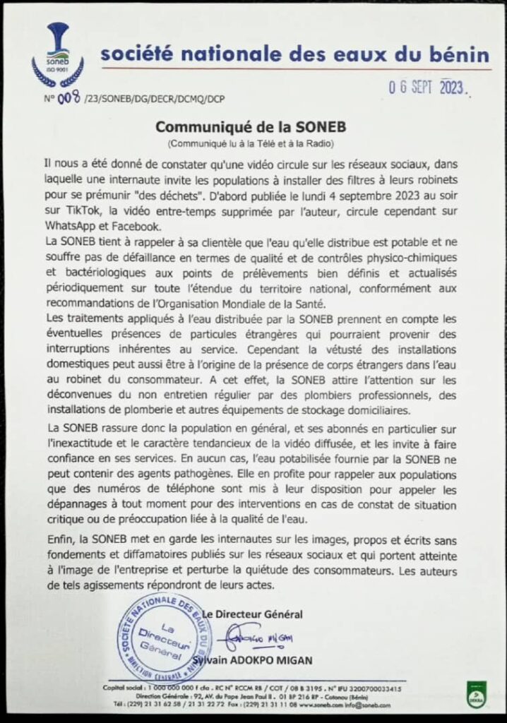 Suite à une vidéo circulant sur les réseaux sociaux faisant état de ce que l’eau fournit par la Société Béninoise des Eaux du Bénin (SONEB) contient des déchets, la structure a réagi. Par un communiqué datant du 06 septembre 2023, le Directeur Général de la SONEB, Sylvain Adokpo Migan, a mis les choses au clair. L’eau que produit et fournit la SONEB est potable. Rappelant que l’eau que la société fournit suit tout le processus d’apurement et de traitement requis en la matière, Sylvain Adokpo Migan, a fait savoir que la vidéo qui circule sur les réseaux sociaux tend à salir son image tout en faisant peur à la population. Par la même occasion, la SONEB met en garde l’auteur de la publication ainsi que ceux qui la partagent avec des commentaires désobligeants contre des poursuites judiciaires. Lisez plutôt !!!