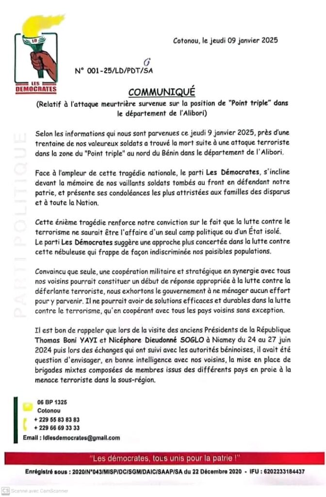 Aussitôt après la nouvelle de l’attaque terroriste subie par l’armée béninoise le 8 janvier 2025, une attaque qui a occasionné << une très lourde perte >> selon le communiqué de l’état-major, la direction du parti d’opposition Les Démocrates a réagi.
