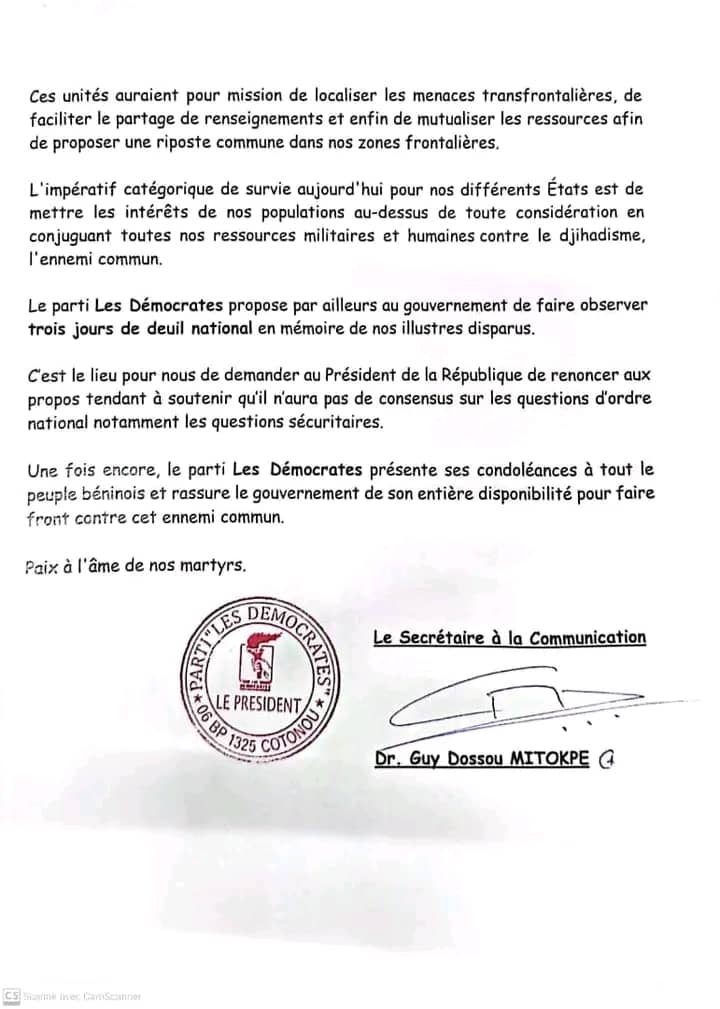 Dans un communiqué de son secrétaire national à la communication, le parti de Boni Yayi, salut la mémoire des soldats disparus tout en réaffirmant sa position. << Cette énième tragédie renforce notre conviction sur le fait que la lutte contre le terrorisme ne saurait être l’affaire d’un seul camp politique ou d’un État isolé>> lit-on dans le communiqué signé par Guy Dossou Mitokpè.