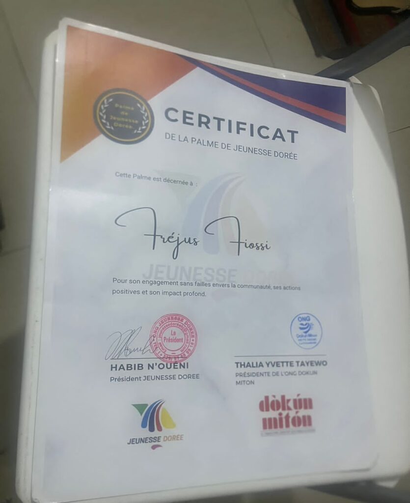 En recevant le Certificat de la Palme de Jeunesse dorée, Fiossi ajoute une nouvelle plume à son chapeau déjà bien garni. Ce certificat est une reconnaissance de son rôle en tant que catalyseur de changement positif et une célébration de sa contribution inestimable à la culture et à la société béninoises.